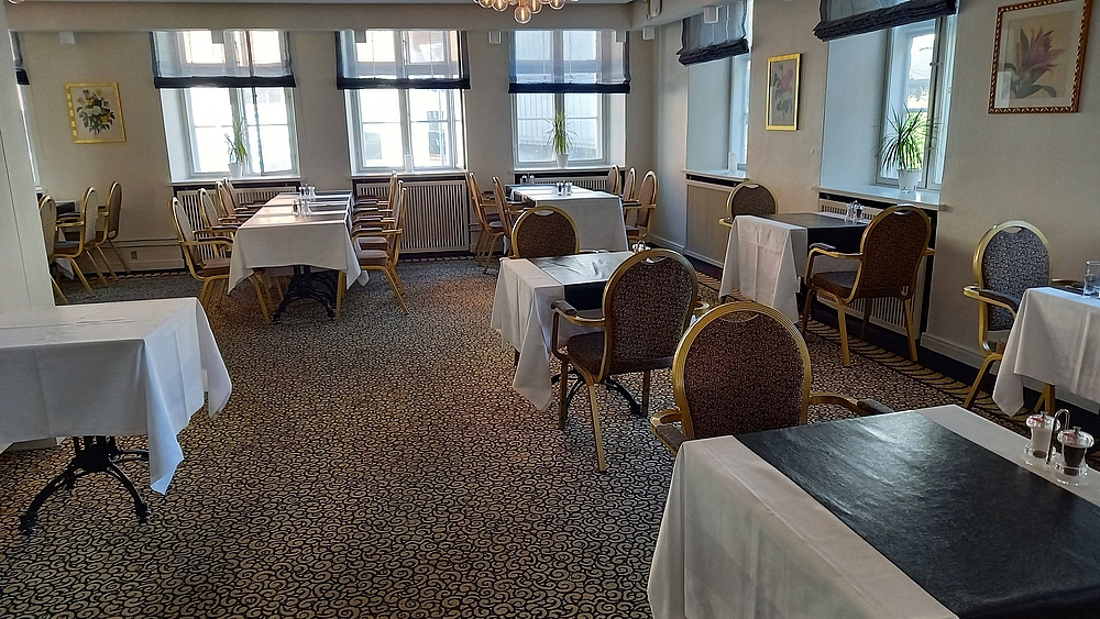 Der er en superspændende og hyggelig à la carte-restaurant i kælderen med smukke hvælvinger. Her blev vi præsenteret for en rigtig lækker 3-retters menu, samt et vinkort med et fint udvalg af vine til meget rimelige priser. Efterfølgende kan man nyde drinks og/eller kaffe i det hyggelige barområde. Morgenbordet var et pænt standard hotelmorgenmad, hvor der konstant blev fyldt op.