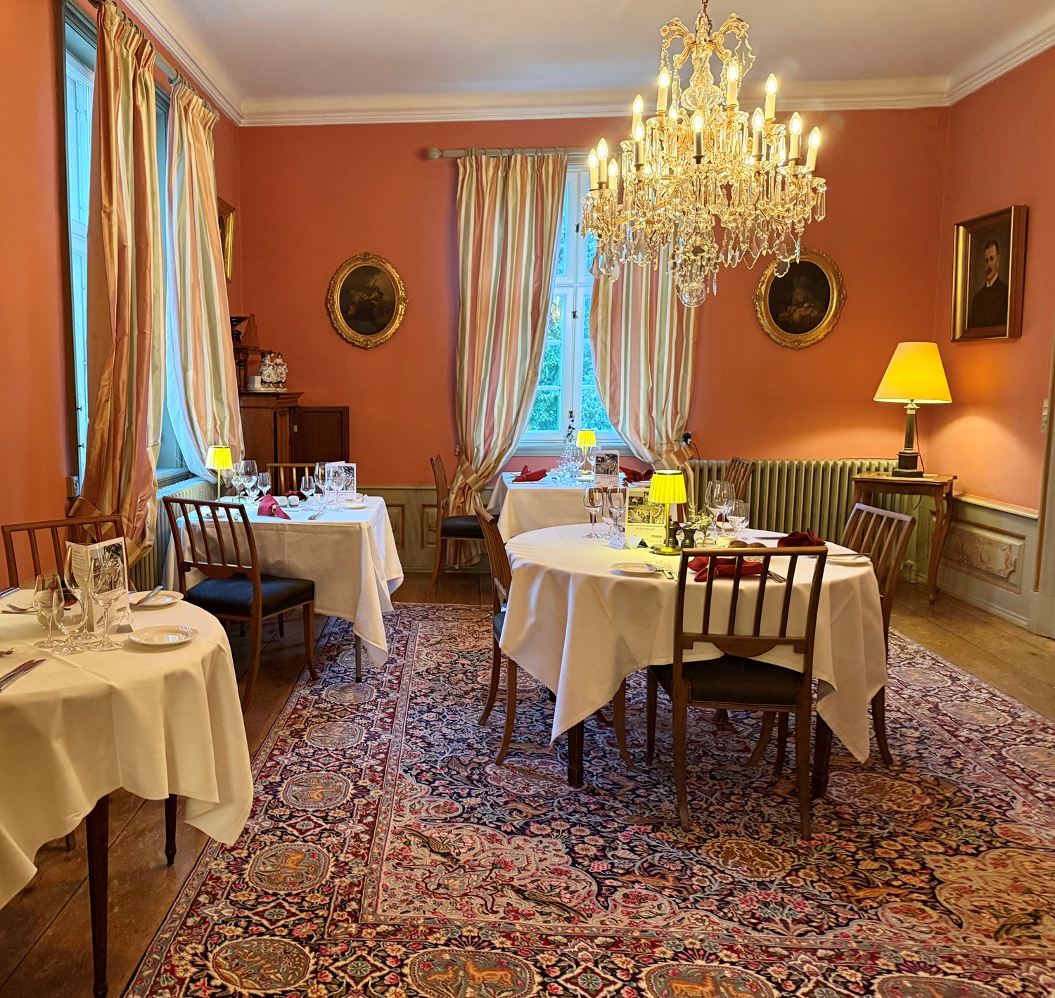 Retterne er kendetegnet ved raffineret enkelhed og smag, og kan nydes sammen med nøje udvalgte vine fra slottets vinkælder. Atmosfæren er hyggelig og afslappet, hvilket gør restauranten til det perfekte samlingspunkt efter en dag på golfbanen.